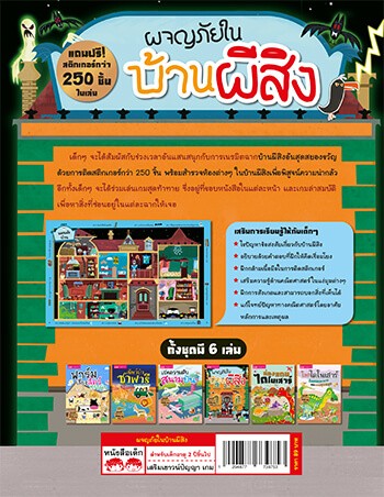 ในหนังสือ "ผจญภัยในบ้านผีสิง" เล่มนี้ เด็กๆ จะได้สัมผัสกับช่วงเวลาอันแสนสนุกกับการเนรมิตฉากบ้านผีสิงอันสุดสยองขวัญด้วยสติกเกอร์กว่า 250 ชิ้น พร้อมสำรวจห้องต่างๆ ในบ้านผีสิงเพื่อพิสูจน์ความน่ากลัว อีกทั้งเด็กๆ จะได้ร่วมเล่มเกมสุดท้าทาย ซึ่งอยู่ที่ขอบหนังสือในแต่ละหน้า และเกมล่าสมบัติเพื่อหาสิ่งที่ซ่อนอยู่ในแต่ละฉากให้เจอ