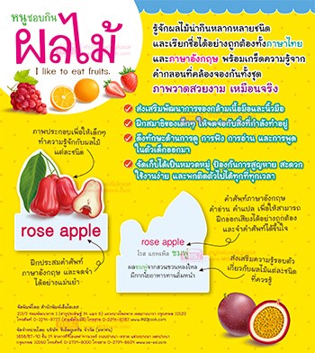 รู้จักผลไม้น่ากินหลากหลายชนิด และเรียกชื่อได้อย่างถูกต้องทั้งภาษาไทยและภาษาอังกฤษ พร้อมเกร็ดความรู้จากคำกลอนที่คล้องจองกันทั้งชุด ภาพวาดสวยงาม เหมือนจริง ส่งเสริมพัฒนาการของกล้ามเนื้อมือและนิ้วมือ ฝึกสมาธิของเด็กๆ ให้จดจ่อกับสิ่งที่กำลังทำอยู่ ดึงทักษะด้านการดู การฟัง การอ่าน และการพูดในตัวเด็กออกมา จัดเก็บได้เป็นหมวดหมู่ ป้องกันการสูญหาย สะดวก ใช้งานง่าย และพกติดตัวไปได้ทุกที่ทุกเวลา