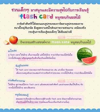 • จับคู่กิจกรรม ใช้ flash card ประกอบการทำกิจกรรมต่างๆ เช่น เล่าเรื่อง ร้องเพลง เพิ่มความสนุกด้วยการแสดงท่าทางหรือทำท่าประกอบ จากนั้นให้เด็กๆ ทายว่าคือผลไม้ชนิดใด เก่งศัพท์จากภาพ ให้เด็กๆ